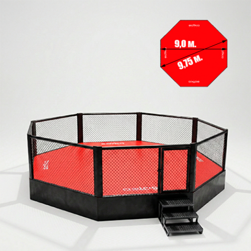 Клетка для боев без правил 9,75 метров в диаметре на помосте. Помост не выступает за габариты сетки. Форма клетки и помоста восьмиугольник. В таких клетках проводят международные соревнования и тренировки любого уровня.